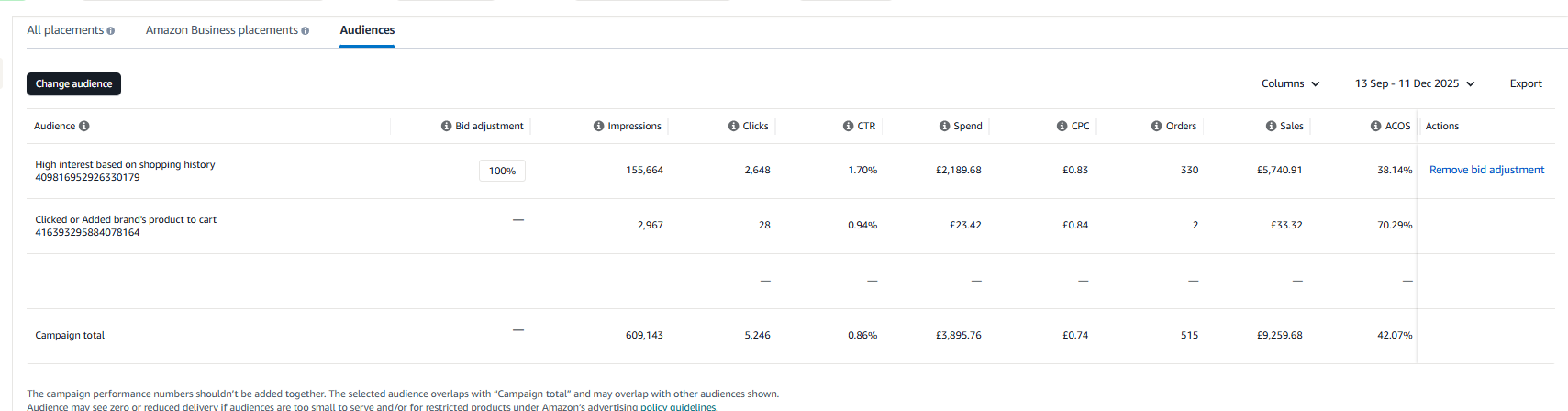 We gave it with +100% bid adjustment (a bit aggressive, mind). The outcome? 38% ACOS – that’s 4% better than our campaign average. Solid win, especially since these audiences drive engaged traffic without the usual waste.