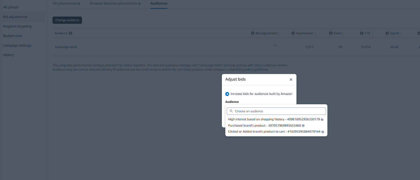 - Spot the audience options and increase the bid for “high interest based on shipping history” – say, +50% to start.